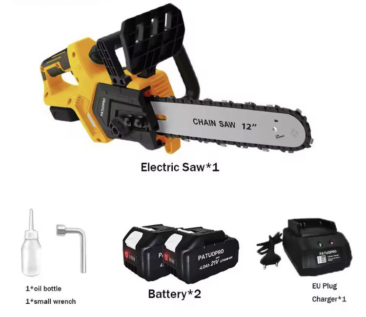 The 12-Inch Brushless Cordless Chainsaw combines power, safety, and portability for all your cutting needs in gardening, landscaping, and light construction work. Powered by two 21V 4.0Ah lithium-ion batteries, it delivers strong performance with up to 3800 RPM chain speed, ensuring smooth and efficient cutting through wood, branches, and logs.